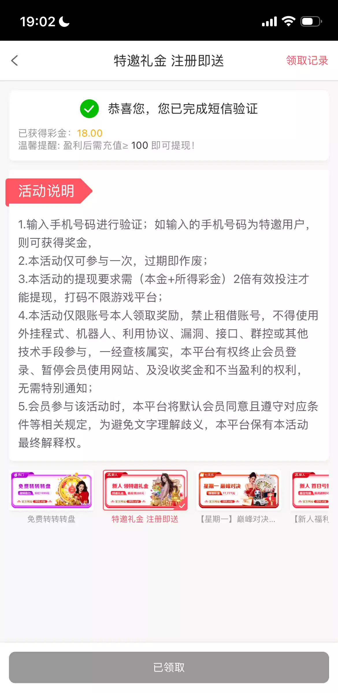 注册绑卡优惠中心,自助领取是吧?但是打满要充值100,这个看个人官网 006.vip